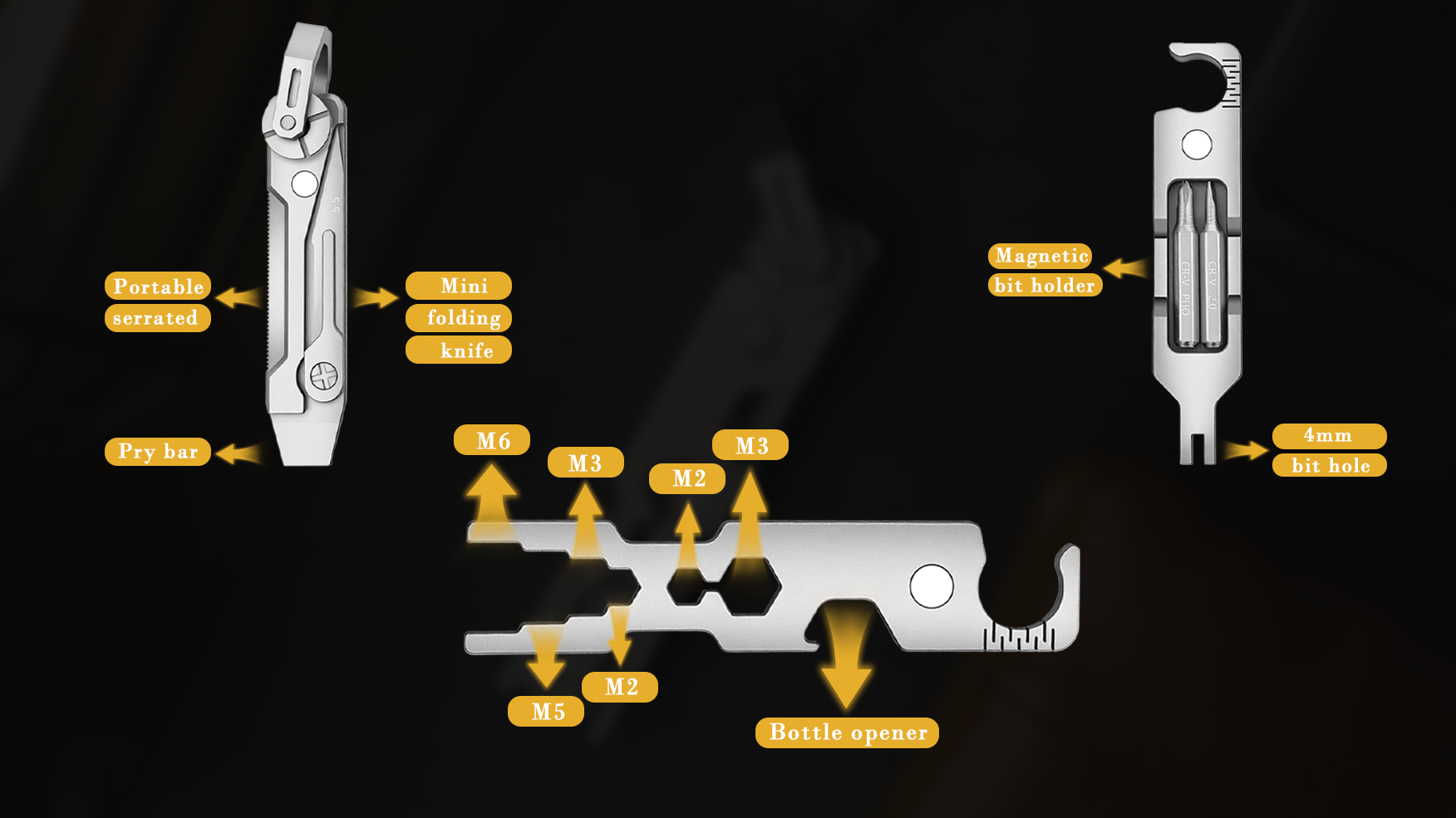 Integrating multiple functions such as built-in surgical knife, bottle opener, wrench (4 sizes), screwdriver, portable sawing machine, pry bar, etc